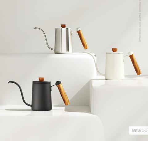 Cafetera de mano de acero inoxidable 600 con mango de madera maciza, 304 ml, boca larga, fina, Vertical